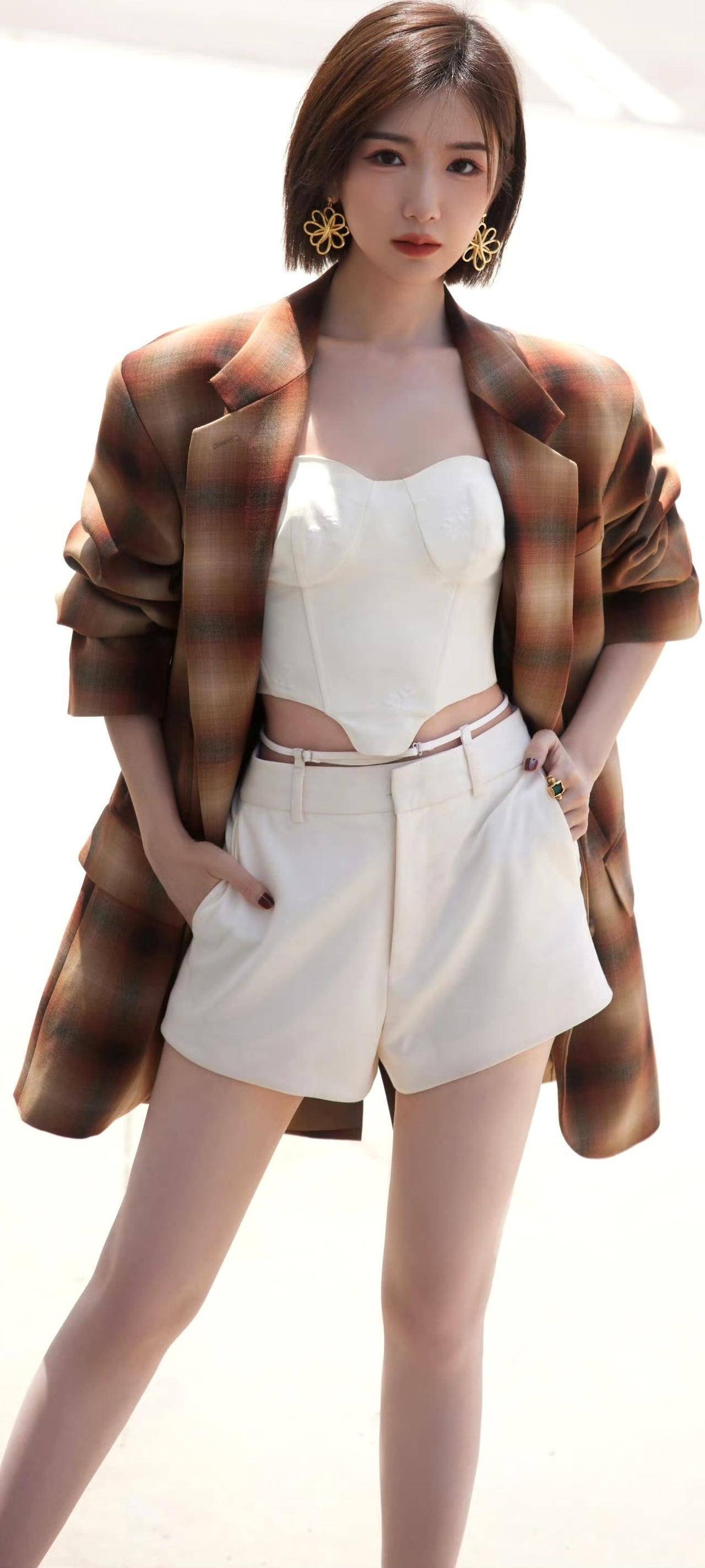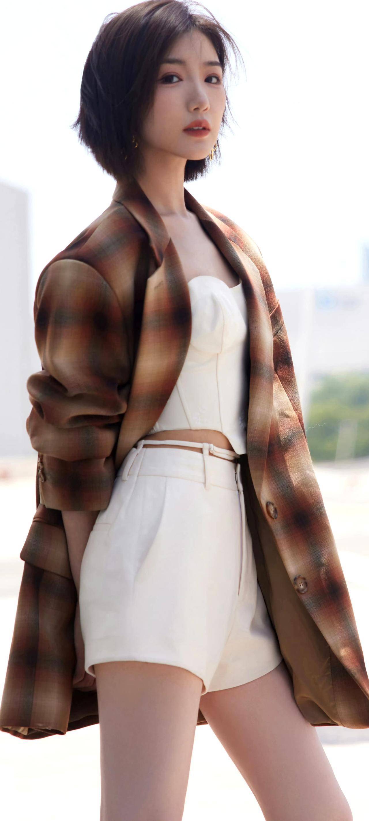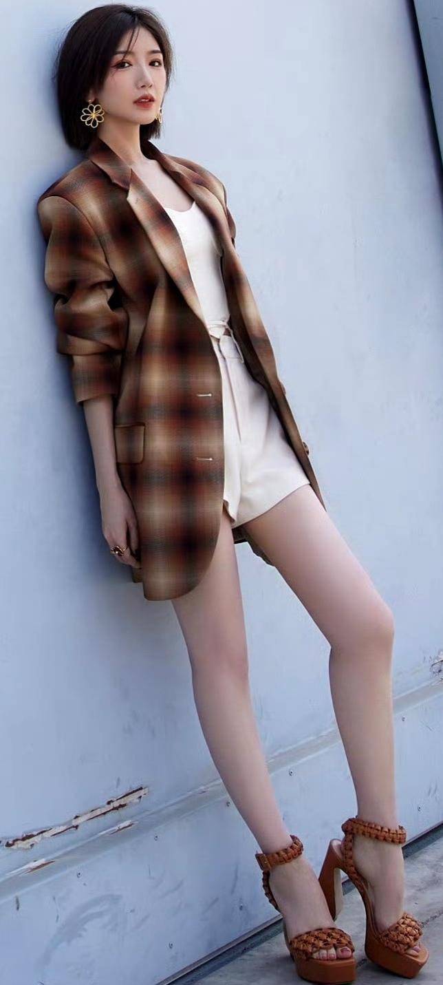 毛晓彤以格子外套搭配短裤的造型,可谓是时尚感拉满。